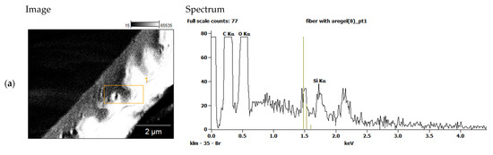 The pure PET fibers exhibited a smooth surface, while the aerogel exhibited small particles on the composite fibers’ surface. This was also confirmed by EDX measurements of an aerogel-containing fiber, proving that the silica aerogel particles are both present on the surface and inside the fiber (Figure 5). This suggests that the aerogel particles are intermixed well with the polymer and were encapsulated in a polymer matrix within the fiber. It should be noted that unstable spinning at high airflow rates and low aerogel incorporation at low airflow rates place some limitations on the aerogel content of the fibers in the experimental setup used.