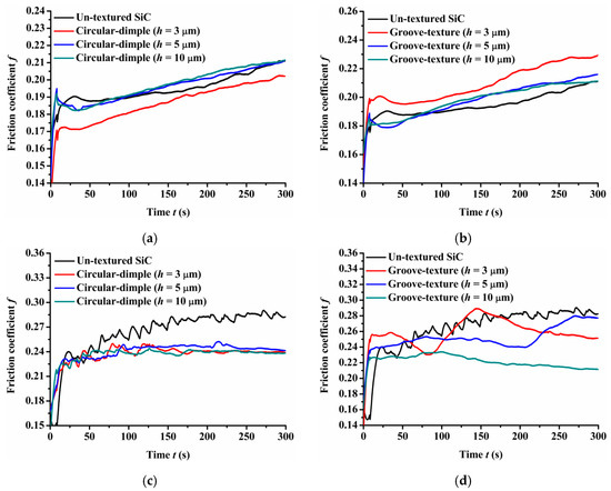 When the friction pair was SiC-PTFE, the friction coefficient trend was different to SiC-steel friction pair, as shown in Figure 6c,d. The friction coefficient of circular bumpy surface has been lesser than that of the un-textured surface as presented in Figure 6c. Under this condition, the texture depth had little influence on the friction coefficient. Whereas, for the groove-textured surface, the friction coefficient was also lower than that of the un-textured surface similar to the circular-dimple-textured surface. The groove depth had a stronger effect on the friction performance than the circular-dimple-textures as the values of friction coefficient had relatively large dispersibility. When the depth was 3 μm, the friction coefficient fluctuations were relatively large, but the value was lower than that of the un-textured surface for most of the sliding time.