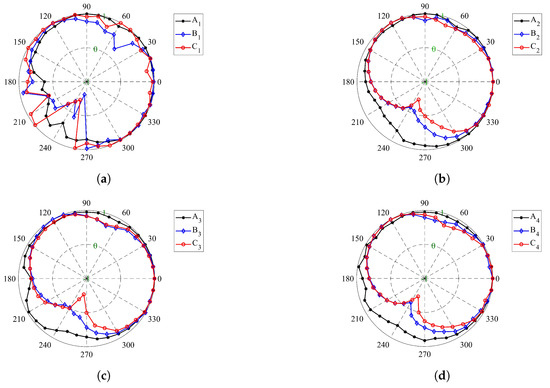 In the previous section, it was shown that the mechanical behavior of the coke aggregates is strongly dependent on the particle shape parameter. Hence, in this section, the effects of the rolling friction coefficient as a parameter of particle shape on the stress–strain diagram and volumetric strain–strain diagram are also investigated. To achieve this goal, four specimens (specimens to ), which are made of a triple mixture of coke (RVE3000TCM), are taken into account. Figure 7a,b represent the axial stress–axial strain and volumetric strain–axial strain, respectively, for the specimens with different rolling friction coefficient ().