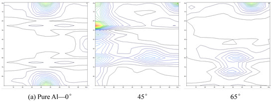 Figure 7 presents the orientation distribution functions (ODFs) at φ2 = 0°, 45°, and 65° sections for the pure Al and Al with 0.5, 1.0 vol.% CNTs, respectively. Compared with the typical preferred crystallographic orientations in rolled face-centered-cubic (FCC) metals, the texture of pure Al was nearly randomly distributed, and rotated cube and copper components appeared with relatively low orientation density, as shown in Figure 7a. There was no novel texture type developed in Al with 0.5, 1.0 vol.% CNTs, as shown in Figure 7b,c. However, the texture density was enhanced from 7.5 to 18.9 with the CNTs content increasing.