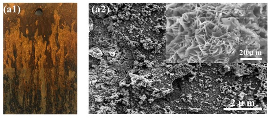 Surface macro (a1–c1) and micro (a2–c2) morphology of corrosion products of medium-Mn steel at different corrosion stages: (a1,a2) 72 h; (b1,b2) 288 h; (c1,c2) 600 h.