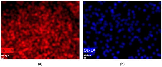 Based on EDS signal and mapping results, the peaks at 9.59°, 15.12°, 19.20°, 28.97°, and 49.24° could be related to a phase or various phases of carbon (graphite, graphite oxide, graphite with Ru intercalated, or a mixture of these phases) [,,,,,,]. Nevertheless, without further information, it is not possible to confirm that. The half-width of every peak was used in the Scherrer equation to calculate the crystallite size (with K = 1). The results in order of appearance are 129, 119, 98, 94, and 94 nm, respectively. These sizes are much larger than those obtained for the Ru and Os metallic phases, which is congruent with the differences observed in the broadness of the respective signals and with SEM micrographs shown in Figure 4.