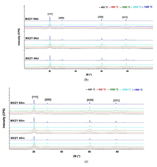 After the hydrothermal synthesis process, for the assessment of phase stability, the powders MxZY 4/6/8% La, MxZY 4/6/8% Nd, MxZY 4/6/8% Sm and MxZY 4/6/8% Gd, were subjected to calcination at various temperatures (400 °C/800 °C/1000 °C/1200 °C/1400 °C, respectively) for 60 min and their phase compositions were analyzed.