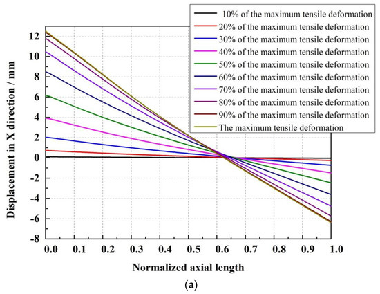 In order to obtain the neutral cross-section position of the lenticular DCB during tensile deformation, the transverse displacement of each position corresponding to the length direction (z direction) of the bonding edge is the output, and the obtained curve is shown in Figure 8. Figure 8 shows the relationship between the normalized axial length (i.e., the z direction) of the bonding edge and the displacement in the X direction under different maximum tensile deformation conditions during the tensile deformation of the lenticular DCB. As can be seen from Figure 8a, under different tensile deformation conditions, there is a position of the 0 point in the X direction displacement, which is between 0.6 and 0.7 in the length direction. The corresponding position here is the position of the neutral cross-section. From Figure 8b, with the increase in tensile deformation, the neutral cross-section position point floats within a certain range (i.e., 0.624–0.679). The normalized axial length of the neutral cross-section position point decreases with the increase in tensile deformation, but the floating range is small, as shown in Figure 9. This study mainly considers flattening caused by tension. As long as one end remains in a completely flattening state, whether caused by tension or compression, the positions of the neutral cross-section are about at 2/3 of the length. However, in the case of compression, the deviation may be larger due to the local deformation of the arc segment contacting the compressive load and due to the influence of boundary conditions.