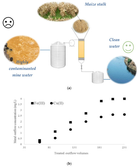 Until now, the removal of metals using modified biomass resulting from the harvesting of agricultural crops is mostly applied only at the batch experimental stage. Experimental engineering applications which have been very little tested up until now are subjected to analysis in this study. It is known that water from mining is a complex matrix, rendering it an interesting biomaterial to use in developing technologies with the main goal of the removal of pollutants from the environment. The applicability of maize stalk in Cu(II) and Fe(III) adsorption has been tested through the treatment of mine water obtained after conventional treatment with Ca(OH)2. For this purpose, swollen maize stalk was tested under the conditions described in Section 2.9, where 3000 mL mine water was treated in a column experiment. A fixed-bed schematic representation of mine water treatment based on maize stalk is presented in Figure 5a. As one may observe from Figure 5b, metal outflow adsorption decreased in the biomaterial bed with increasing treated outflow volume. In this case, a possible explanation could be the decrease in the number of active sites available for initial adsorption, and it is difficult to engage fewer accessible sites. Moreover, we observed a saturation plateau in the biomaterial bed when available groups or macroporous structures are loaded [40,41].