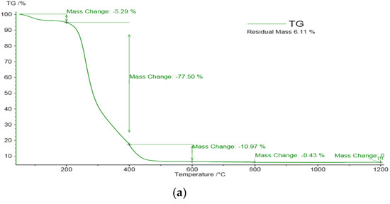 The adsorption of Cu(II) and Fe(III) ions in maize stalk after mine water treatment and from leachate tailing solutions was evaluated by thermal analysis. The thermal decomposition (TG) behavior of activated maize stalk was assessed in previous research [18]. Using TG, a variation in weight loss depending on the temperature range was observed. In the first pyrolysis stage, TG curves showed up to 5.29% and 10.5% weight loss in the 30–200 °C temperature range (Figure 8a,b) from the solid phases studied, which is associated with water molecules being retained by metal ions trough ionic bonds. In the next stage, significant weight loss in the 200–400 °C temperature range may be attributed firstly to hemicellulose and secondly to cellulose pyrolysis. The lower weight mass loss of 32.3% for maize stalk loaded with tailing solution suggests the occurrence of metal ion retention in the biomaterial mass, which influenced the stabilization of the hemicellulose/cellulose structure.