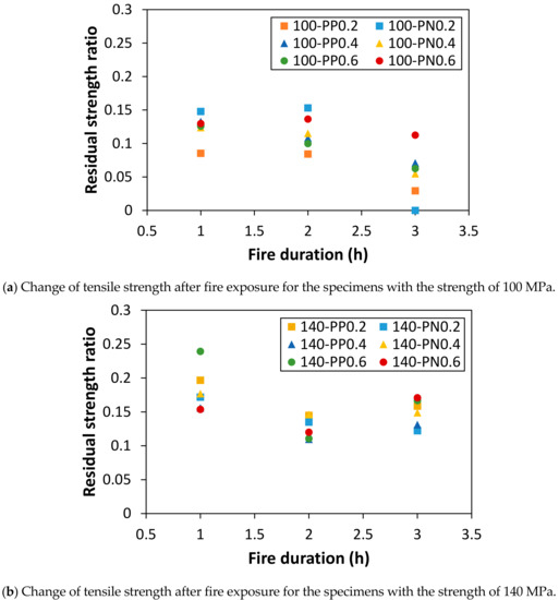 The ratio of the tensile strength with respect to the results of the specimens without fire damage for each case is presented in Figure 8. A significant reduction in strength can be observed. Further, the residual strength tends to increase as the matrix strength increases (see Figure 6). The reduction in the strength ratio is more noticeable in the case of a higher matrix strength as the fire exposure time increases, compared with the change in the case of a lower matrix strength. This can be attributed to the observation of a lower cumulated porosity with a higher matrix strength when the HPFRCC specimens are exposed to fire for an hour [37]. However, as the exposure time to fire increases, increased numbers of microcracks and voids are generated owing to the internal pressure. The matrix strength noticeably decreases, although a major portion of the internal pressure is alleviated through the channels created by the melting of the synthetic fibers. Furthermore, the decrease in the residual strength ratio with an increase in the exposure time is not noticeable at a lower strength value, owing to the relatively large accumulation of microcracks and porosity after 1 h of fire exposure.