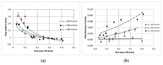 Based on the measurements of the geometrical dimensions of the chips obtained in the cutting tests, the relationships between the dimensions of the width h and the thickness b of the chips, chip compression ratio Λl, and the shear angle Φ were determined (Figure 23). A decrease in chip width b was observed with a simultaneous increase in chip thickness h upon the progressive wear of the tool VB. For VB > 0.4 mm, the values of the chip compression ratio for all tested cutting speeds reached the value of Λl = 1.5. The calculated value of the shear angle was in the range of Φ = 18–35 degree.