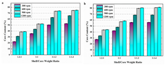 Figure 4 represents the core content of microcapsules at different preparation parameters. As can be seen from Figure 4, the core content of microcapsules continued to increase when the shell/core weight ratio was decreased from 1.2:1 to 1:1.2 at the same preparation temperature and stirring speed. When the shell/core weight ratio was decreased from 1:1.2 to 1:1.4, the core content of the microcapsules did not increase significantly. This was due to the limited ability of the microcrystalline wax to encapsulate excess E-51 epoxy resin.