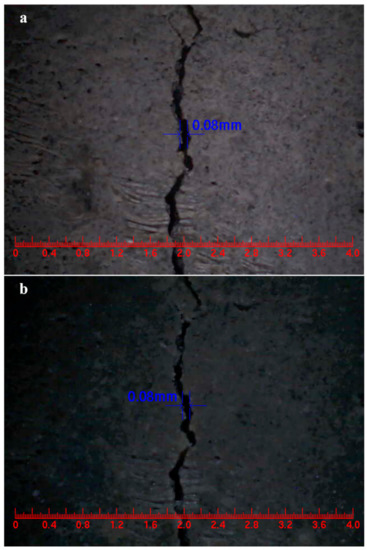 The purpose of developing self-healing cementitious materials is to obtain good healing properties when cracks occur in cementitious materials. Therefore, the main objective of this study was to provide convincing and direct evidence for the self-healing ability of cementitious materials containing microcapsules. To achieve this objective, mortar specimens with microcapsules were pre-cracked by the three-point bending method, and then the healing of the cracks was measured. The content of microcapsules in the mortar was 4% of the cement weight. Comparing Figure 19a,b, the initial width of the surface crack in the control mortar was 0.08 mm, and the width of the surface crack did not change after three days of self-healing. However, it could be found from Figure 19c,d that the surface cracks with an initial width of 0.28 mm in the mortar containing microcapsules were self-healing after three days. The results indicate that the mortar containing microcapsules could rapidly self-heal surface cracks with widths less than 0.28 mm.