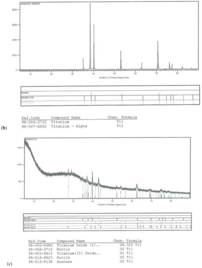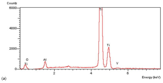 On all the titanium surfaces analyzed, Energy Dispersive X-ray (EDS) and X-ray Power Diffraction (XRD) analyses showed the presence of biocompatible elements (Oxygen, Titanium, Aluminum, and Vanadium and compounds) (Figure 5a–d).
