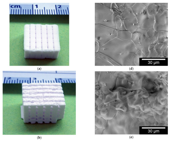 Macro and microstructure of the scaffolds; exemplary images of band width 2000 µm three different pore sizes: (a) 500 µm; (b) 750 µm; and (c) 1000 µm; microstructures taken with FEI QUANTA 250 FEG, 20 kV, 3200× magnification (HFW 93.3 µm) of the sample surface: (d) 500 µm; (e) 750 µm; and (f) 1000 µm.