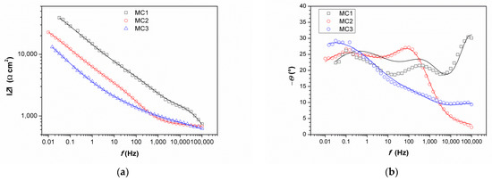 Impedance spectra obtained on MC: (a) impedance modulus Bode plot, (b) phase angle Bode plot, and (c) Nyquist plot. Symbols represent measured and lines fitted data.