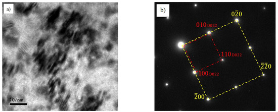 In order to more clearly characterize the microstructure of D022, Figure 13 exhibits the TEM structure of Al3Ta phase. According to the image, the Al3Ta phase is needle like and has a certain orientation. It presents a crystallographic relationship with the matrix, [001]D022//[001]Matrix. The diffraction pattern in Figure 13b clearly illustrates this relationship. It can see that plane 0) of the matrix corresponds to plane (110) of D022-type Al3Ta phase. Moreover, stereographic projection of the orientation relationship denotes the crystal plane correspondence between the two phases more clearly, as shown in Figure 13c,d. This orientation relationship further indicates that the formation of Al3Ta contributes to the improvement of its strength and toughness. Therefore, the reliability of the simulation is further confirmed by the experiments, which has important reference values for the design and application of this material.