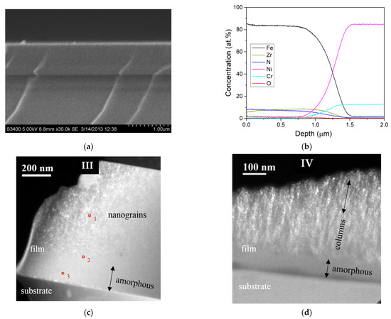 The target was a Fe disk, with Zr chips evenly distributed in the erosion zone, the content of which was ranged from 0 to 13.4 wt.% of the entire target (the information on the preparation method is available in detail in [27]). The deposition time of all studied films was 7 min. The chemical composition of the films on glass substrates was determined by energy dispersive X-ray spectroscopy (EDX) using a Hitachi S-3400N (Hitachi High-Technologies, Tokyo, Japan) scanning electron microscope (SEM) equipped with a Noran 7 Thermo attachment. The film thickness (Table 1) was estimated using the cross-sectional electron micrographs (Figure 1a) (SEM). An accurate assessment of the content of light elements (N, O) was carried out for the films deposited on metallic (Ni-Cr) substrates by glow discharge optical emission spectroscopy (GDOES) using a Horiba Jobin Yvon Profiler 2 (Horiba Jobin Yvon, Longjumeau, France). The Ni-Cr substrates were used exclusively for GDOES measurements on the as-deposited films. The rest of the measurements were performed on the glass substrates.
