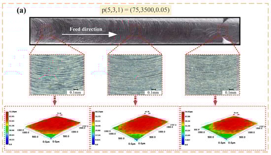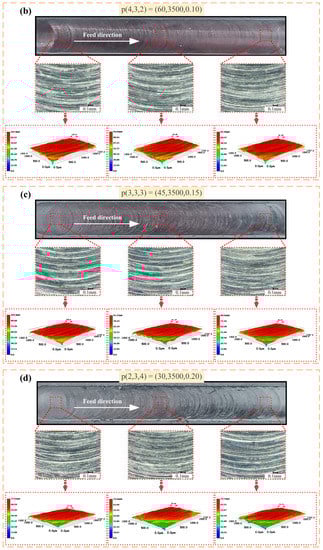 Take Experiments 3, 8, 13, 18 and 23 as examples; the processed surface morphology is shown in Figure 6. The middle of the picture shows the machined surface after 200 times magnification, and the bottom side shows the 3D morphology of the machined surface after 200 times magnification. The surface after milling has obvious tool marks. The evenly distributed tool marks reflect the movement trajectory of the cutting edge of the milling cutter. At the same time, it can be seen that the surface quality at the beginning of milling is poor, and then gradually stabilizes until the tool is completely removed.
