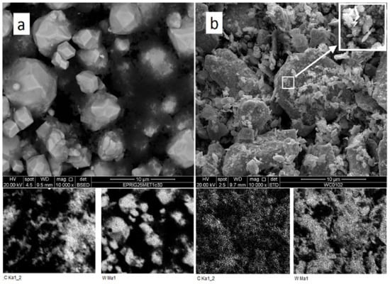 SEM and EDX analysis of as-mixed (a) and milled (b) W + 1.3% C powder.