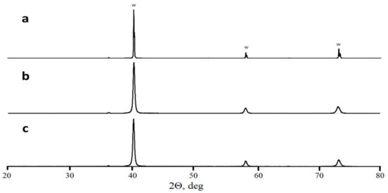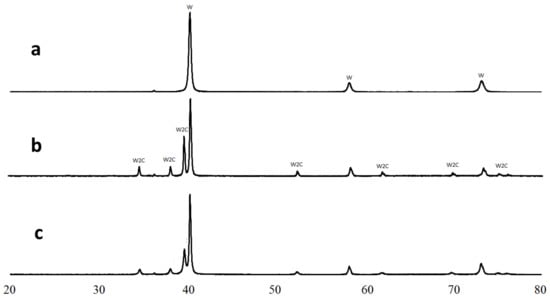 X-ray diffractometry of as-mixed W powder (a), milled W powder (b), and milled W + 1.3% C powder (c).