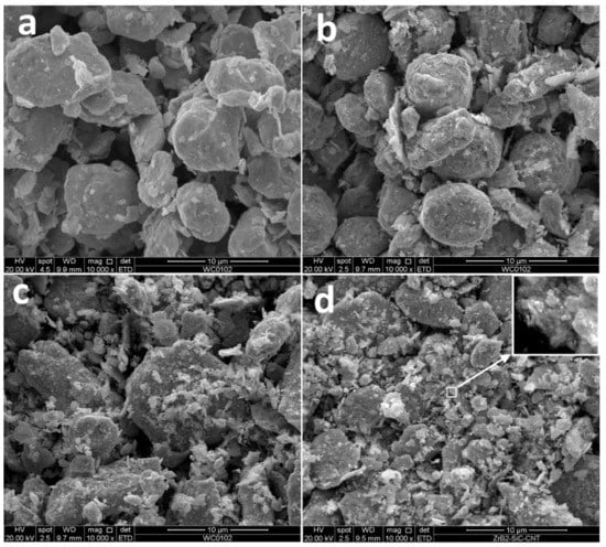 Secondary electron images of milled powders: (a) pure tungsten, (b) W + 0.6% C, (c) W + 1.3% C, (d) W + 1.9% C.
