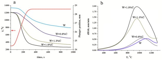 The dependence of the charge shrinkage on sintering time for the samples pressed at 1300 °C (see Figure 4) shows that carbon addition improves the densification kinetics significantly. Considering that the green body amounts were weighted to obtain 4 mm nonporous samples, carbon presence increased even the green body density. At temperature rise, the undoped tungsten consolidation started at approximately 1000 °C, which corresponds to the temperature of the tungsten yield strength reduction [] and occurs by the plastic deformation of the most stressed grain-contact areas. As shown in [], the yield strength at 1300 °C does not exceed 30% of that of the room temperature and the overall charge shrinkage approximates 2.3 mm, resulting in a sample density of 13.6 g/cm3 (see Table 1). An addition of 0.6% carbon did not increase the densification speed but extended the period of intense consolidation and led at last to shrinkage of 2.8mm and a material density of 16.76 g/cm3. Further carbon addition led to an essential rise of the densification speed up to 1.5 and 2 mm/min (Figure 4b) and the overall shrinkage of 3.6 and 3.8 mm, respectively. It should also be noted that the maximum acceleration of the consolidation process shifted to lower temperatures and can be observed at approximately 900 °C. As shown in [], such consolidation behaviour can be attributed to the in situ reaction.