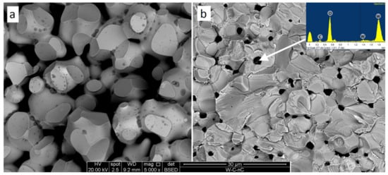 Fracture surfaces of pure tungsten (a) and W + 1.3% C with the point EDX analysis (b). Both samples (Samples 1 and 3) were sintered at 1850 °C. BSE images.