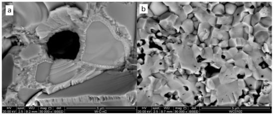 As shown in [], at temperatures lower than 1250 °C, the only thermodynamically stable W-C phase is tungsten carbide WC. However, the XRD-analysis of the sintered samples (see Figure 5c) indicated tungsten hemicarbide W2C existence alongside tungsten. Moreover, the sample produced at 900 °C also contained only the W2C phase with no hints of thermodynamically more stable WC crystals (see Figure 5b).