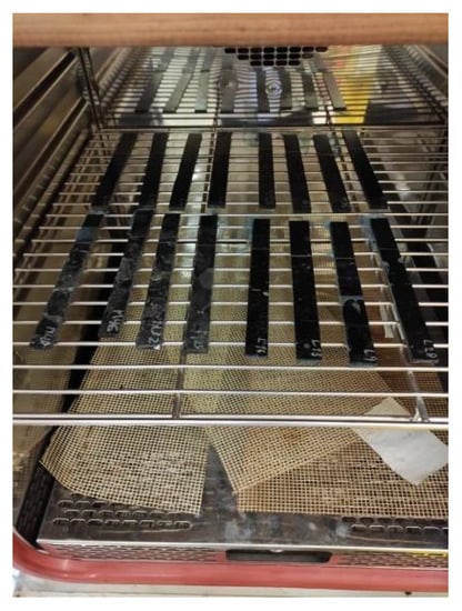 For the accelerated simulation of the hygrothermal process, a climatic chamber brand Vötsch, model VC 2020, was used. It is programmed to maintain constant environmental conditions during the time the samples are inside. In this case, the selected environmental conditions for this treatment were a constant temperature of 60 °C and a relative humidity of 70% [,]. The test sample’s times spent in the chamber were 1, 2, 4 and 24 weeks. In Figure 2, you can see the arrangement of some of the samples inside the climatic chamber.