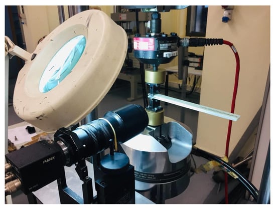 All of our samples were tested using a servo hydraulic test machine (MTS 810) equipped with a load cell of 5 kN at a constant test velocity of 2 mm/min and at room temperature. A high-resolution camera monitored the advance of the crack. Two different positions of the crack tip can be seen in Figure 4.