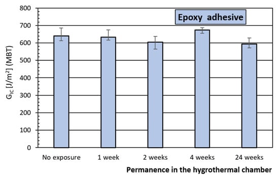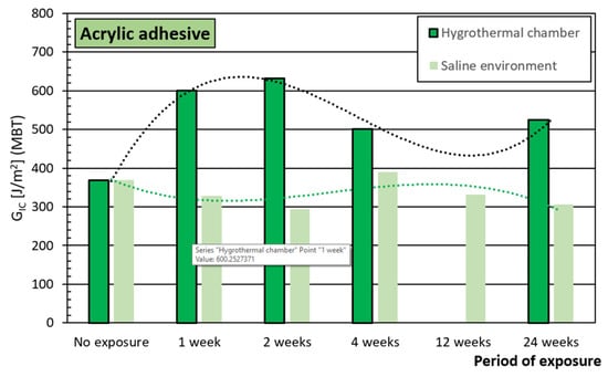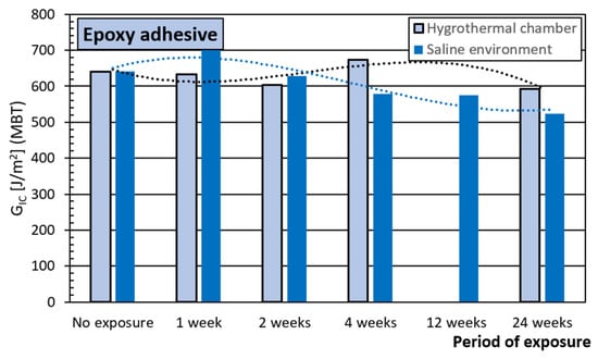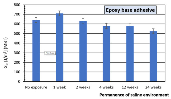 For the epoxy adhesive, it can be seen that the conditions to which it has been subjected modify its behavior in regard to the original, with no exposure. The result is a loss of the delamination resistance capacity, except in the first week of exposure in which the energy release rates obtained are higher than the ones from a material with no exposure to this environment, 11%. From this moment on, a continued decline begins so that after 24 weeks, the loss is approximate to 20%.