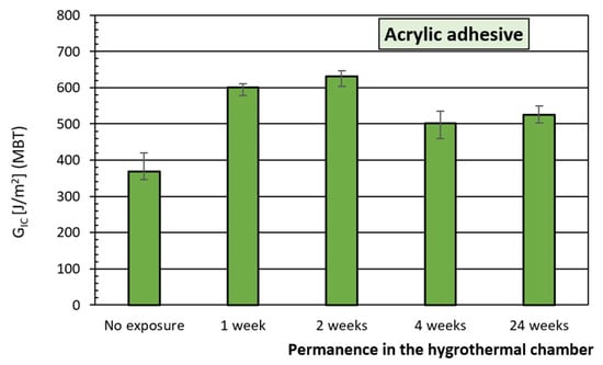 In Figure 10, for the acrylic adhesive, it shows the energy release rate under mode I of the fracture as a function of the different time periods of exposure considered for the types of chamber degradation they have been subjected to.