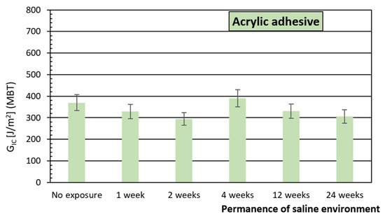 For the acrylic adhesive, the exposure of the tested samples in a saline environment slightly modifies its behavior to delamination.