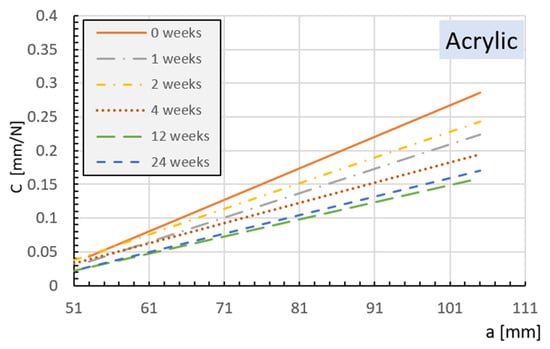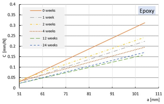 Figure 11 and Figure 12 represent the evolution of the flexibility C [δ/P] trend lines versus the length of the delamination in the crack growth phase for some of the test samples. These have been considered representatives of the materials’ behavior for the different exposure periods determined in the saline-fog chamber. Both analyzed adhesives have been represented.