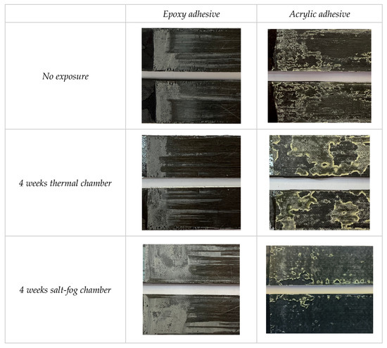 Once the samples had been tested, the resulting fractured surfaces were analyzed. Figure 13 presents a summary of the different superficial failures obtained, from some of the test samples considered to be more representative, according to the type of aging for each of the adhesives used.