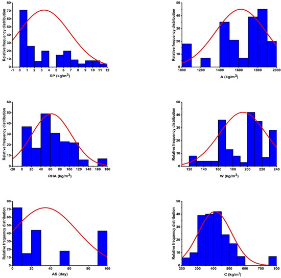The compressive strength of cubic specimens was converted to the compressive strength of cylinders using a conversion ratio of 0.8 [59]. The purpose of this research was to determine the compressive strength of various CRHA mixtures using MEP. As input parameters, variables such as the amount of cement (C), the amount of water (W), amount of RHA, age of concrete (AS), amount of aggregate (A), and dosage of SP were collected from the literature. Figure 5 depicts histograms for all variables utilized in this investigation. Additionally, Table 2 has a statistical description of the gathered data. The mean and median for all AS values were obtained to be 34.57 and 28, respectively. While the value of skewness is positive for all the variables except for water and fine aggregate.