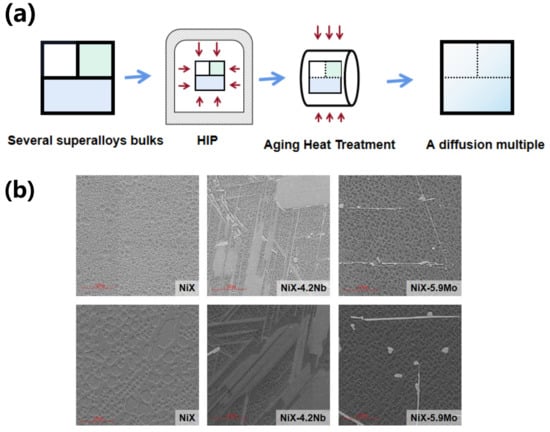 (a) The high throughput experimental preparation process of Ni-based superalloys; (b) The acquired microstructure by SEM at temperatures 900 C and 1000 C.