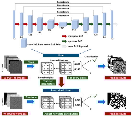 The schematic flowchart of deep transfer learning method from W-900 to W-1000, wherein the U-Net architecture is employed as the basic network.