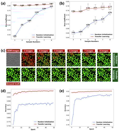 To have a visual comparison, Figure 3a,b present the box plots of the Dice-coefficient of two methods at different sample numbers, which is able to show the distribution of these 20 times experimental results comprehensively. In these figures, we can clearly observe the statistical characteristics of experimental results, including upper extreme, upper quartile, median, lower quartile, and lower extreme. It can be seen that as the number of labeled images n increases, the Dice-coefficient of random initialization has a more rapid improvement than that of deep transfer learning. It also supports that deep transfer learning can achieve excellent performance when there are only a few labeled images. Meanwhile, we can see that the variance of deep transfer learning is generally smaller than that of random initialization, especially during the transfer from W-900 to W-1000. It means that the deep transfer learning is more robust than the random initialization. Figure 3c visually presents the microstructure recognition performance on phase. Wherein the green part represents the , the red part represents the false negative (), the blue part represents the false positive () and the black part represents the . We can see that random initialization tends to produce when n is small. In contrast, deep transfer learning can generally produce with a little pixel-level and . It may owe to the pre-trained process in the deep transfer learning.