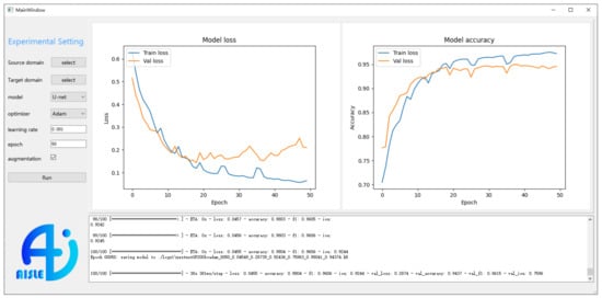 To facilitate the Ni-based superalloys microstructure recognition, we have developed and designed a simple software by PyQt Designer []. As shown in Figure 4, the overall software interface mainly contains the user input (left part) and real time monitoring (right part). The left part includes the common settings during the deep transfer learning experiment, such as the path of the source domain, the path of the target domain, the choice of network architecture of basic model, the choice of optimizer, the initial learning rate, the number of training epochs, and the use of data augmentation. The deep transfer learning model will start training after the button “run” is pressed. In the upper right window, the model loss and accuracy vs. different epochs are visualized and updated in real time. Meanwhile, the progress bar of the whole training is also presented in the lower right window. In general, the developed software can conduct deep transfer learning experiment through simple operation for the user.