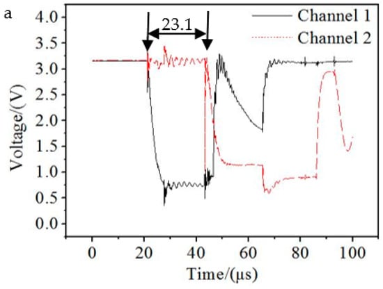 Two speed measurement tests were conducted to improve accuracy and repeatability. The distances L of the two tests are 174 mm and 134 mm respectively. The measured time is shown in Figure 21. According to Equation (16), the head velocities of the explosive charge jet are 7532.47 m/s and 7657.14 m/s respectively, and the average velocity is 7594.81 m/s. Compared with the average speed of the two tests in Figure 21, the head velocity error of the explosive charge jet in Figure 15 is 4.40%.