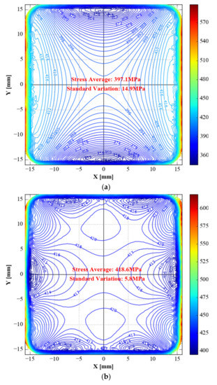 The topology-optimised specimen has the lowest standard deviation (5.8 MPa) in the observation area, followed by the sample optimised by topology combined with shape (6.8 MPa). The original specimen’s standard deviation (14.9 MPa) is greater than the two optimised specimens mentioned above.