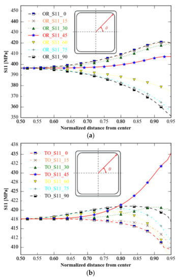 As the straight lines of S11 and S22 are symmetrical in the 45 degree direction across the origin under equiaxial tension, we sketch the stress distribution of S11 along 0°and 90° (Figure 15).