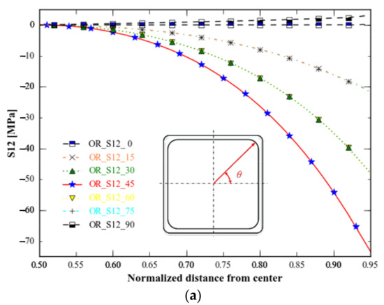 The topology-optimised specimen has the lowest stress range for S12, followed by the topology and shape-optimised specimen (Figure 16). Stress distributions in all directions for topology-optimised specimen S12 and topology optimisation combined with shape optimisation differ from those observed for the original specimen, particularly those in the 45 degree direction: S12 from the centre to the boundary, where the original specimen and the specimen of topology optimisation combined with shape optimisation decrease, whereas the specimen of topology optimisation increases first and then decreases, which makes the stress distribution of the specimen optimised for topology and shape similar to that of the original specimen in different directions, but the former exhibits more minor stress change than the latter.