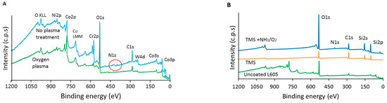 As shown in Figure 2A and Table 1, XPS survey spectrum for uncoated L605 prior to oxygen plasma treatment indicates the presence of N 1s peak, which disappeared after oxygen plasma pretreatment. After oxygen plasma treatment, that N 1s percentage was reduced from 0.81 ± 0.01 at.% to 0 and C 1s declined from 34.98 ± 1.56 at.% to 25.15 ± 2.46 at.% for L605 samples, implying the clean L605 surfaces prior to the TMS plasma nanocoating process. The contamination removal is considered beneficial to the adhesion of plasma nanocoatings to the L605 substrates. The increase of O 1s percentage from 44.7 ± 2.04 at.% to 61.4 ± 3.12 at.% confirms that the L605 surface not only contains O element inherently in its oxide layer, but also O element incorporated by oxygen plasma treatment.