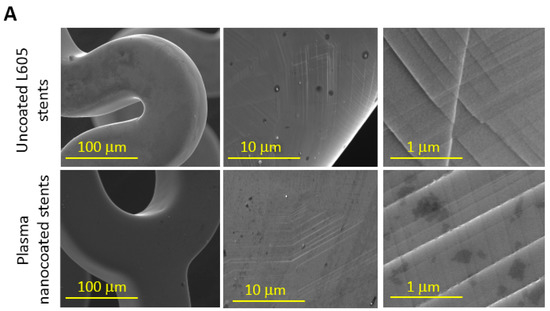 SEM images at high magnification were used to examine any possible failures on stent surfaces such as cracking and coating detachment. Figure 3A shows the images obtained using SEM for uncoated L605 and plasma-nanocoated stents. These images were acquired after stents were crimped down to diameter of 0.75 mm for 30 s and expanded to diameter of 3 mm for 30 s. At low magnification, plasma-nanocoated stent surfaces appeared smoother and more conformal without any defects compared to uncoated L605 stents. At higher magnification, however, many slip lines due to movement of several dislocations were found vertically and horizontally on both stent surfaces after crimping and expanding processes. Neither cracking nor delamination was observed for the plasma nanocoatings. At very high magnification, post-dilated surface texture of uncoated and plasma-nanocoated L605 stents contains multiple shallow and shaft pits and ridges due to dilation processes. No sign of micro-cracking and delamination were observed for plasma-nanocoated stents.
