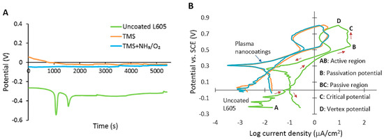 Open circuit potential (OCP) gives information about stability of the sample surface in a particular corrosion environment. It shows time variation with changes in oxidation tendency of the surface. Corrosion potential (Ecorr) is the electrical potential when no electrical current flows. The OCP curves for uncoated, TMS plasma-nanocoated, and TMS+NH3/O2 plasma-nanocoated L605 coupons are presented in Figure 4A. Each condition was repeated three times to ensure reproducibility. At the beginning of immersion, Ecorr of the uncoated L605 dropped abruptly to −0.55 V (vs. SCE). Ecorr reached an equilibrium value of −0.26 V for uncoated L605 samples within 1.5 h. During the same immersion time, more noble corrosion potentials (approximately −0.03 V) were obtained for TMS+NH3/O2 plasma-nanocoated L605 surfaces.