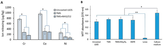Figure 5A shows metal ion releasing concentration for uncoated L605 and plasma-nanocoated samples into DI water after an ion releasing test. The ion amount detected in uncoated L605 extracts was considerably higher than the plasma-nanocoated L605 samples. The Cr, Co, and Ni ion concentrations in the extracts of TMS plasma nanocoating with and without NH3/O2 plasma post-treatment modification were similar. In comparison with the uncoated L605 extracts, Cr, Co, and Ni concentrations in extracts of plasma nanocoatings decreased by 64–79%, 67–69%, and 57–72%, respectively, indicating that plasma nanocoatings can reduce ion release from L605 surfaces.