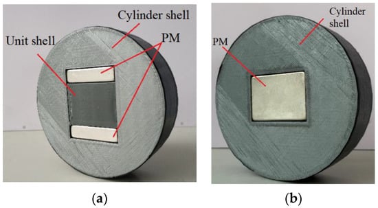 To study the effect of the magnetic field on the STL of the unit filled with MRF (MRF unit), two types of test samples, shown in Figure 1, were designed and fabricated. Each test sample consisted of a cylindrical shell, unit shell, several permanent magnets (PMs), and the MRF.
