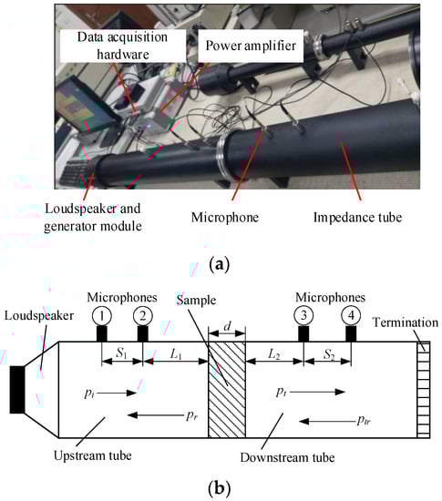 STL test system and test schematic of the impedance tube method. (a) STL test system; (b) test schematic of the impedance tube method.