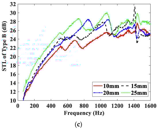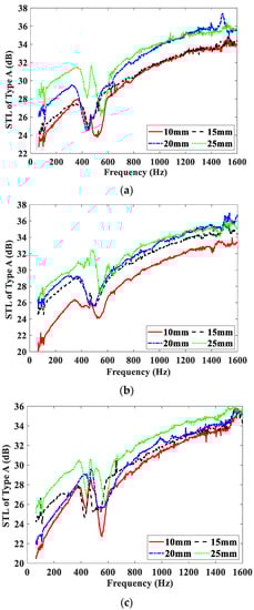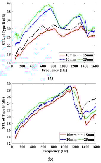 In this section, STL of the test samples measured under different magnetic field directions and intensities are presented, and the effects of the magnetic field intensity and direction on the STL are discussed. As mentioned before, for the Type A and Type B test samples, the magnetic field directions were perpendicular and parallel to the direction of sound wave propagation, respectively. The thickness of the PMs was used to represent the magnetic field intensity.