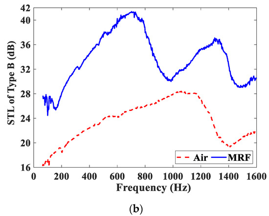 For the Type A and Type B test samples, Figure 8 compares the STL curves of the test samples embedded with the MRF and air units under the same magnetic field intensity. As shown in Figure 8a, the STL curve of the Type A−25 test sample embedded with the MRF unit is slightly higher than that of the test sample embedded with the air unit. This means that when the magnetic field direction is perpendicular to the direction of the sound wave propagation, the MRF unit has no apparent advantages in sound insulation performance over other media. In Figure 8b, the STL curve of the Type B−25 test sample embedded with the MRF unit is greatly higher than that of the test sample embedded with the air unit. The STL peak value of the test sample embedded with the MRF unit is greater than 40 dB. Obviously, when the magnetic field is applied parallel to the sound propagation, MRF demonstrates its absolute advantages in acoustic performance compared with the air.
